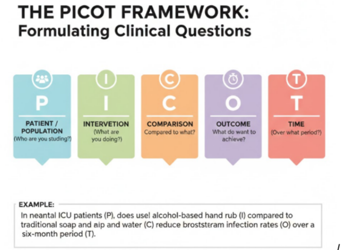 By using this framework, a student can take a broad idea—like “hand washing”—and turn it into a specific research project: “In neonatal ICU patients (P), does the use of alcohol-based rub (I) compared to traditional soap (C) reduce infection rates (O) over a six-month period (T)?”